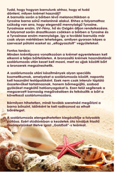 GoldSoli Studió szeretettel várja kedves vendégeit. Kéréseivel forduljon bizalommal hozzánk. Válassza az egészséges barnulást a GoldSoli szolárium stúdióban. Modern szolárium gépeink, felkészült személyzetünk és nem utolsó sorban akcióink, kedvező áraink garantálják az Ön elégedettségét!